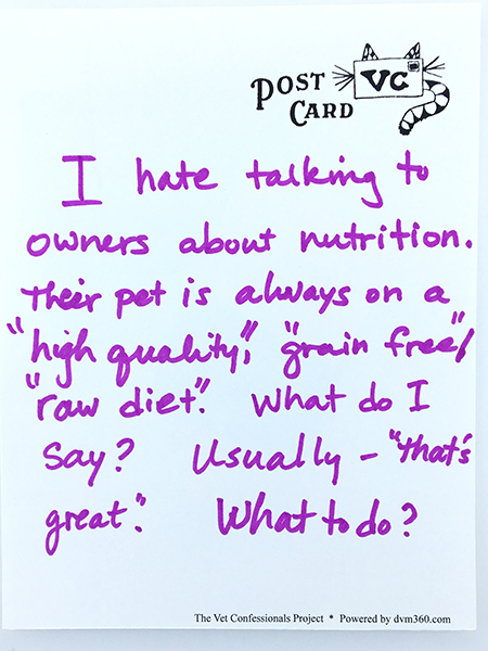 I hate talking to owners about nutrition. Their pet is always on a “high quality,” “grain free”/”raw diet.” What do I say? Usually-“that's great.” What to do?