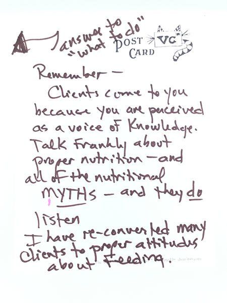 Remember-Clients come to you because you are perceived as a voice of knowledge. Talk frankly about proper nutrition-and all of the nutritional MYTHS-and they do listen. I have re-converted many clients to proper attitudes about feeding.