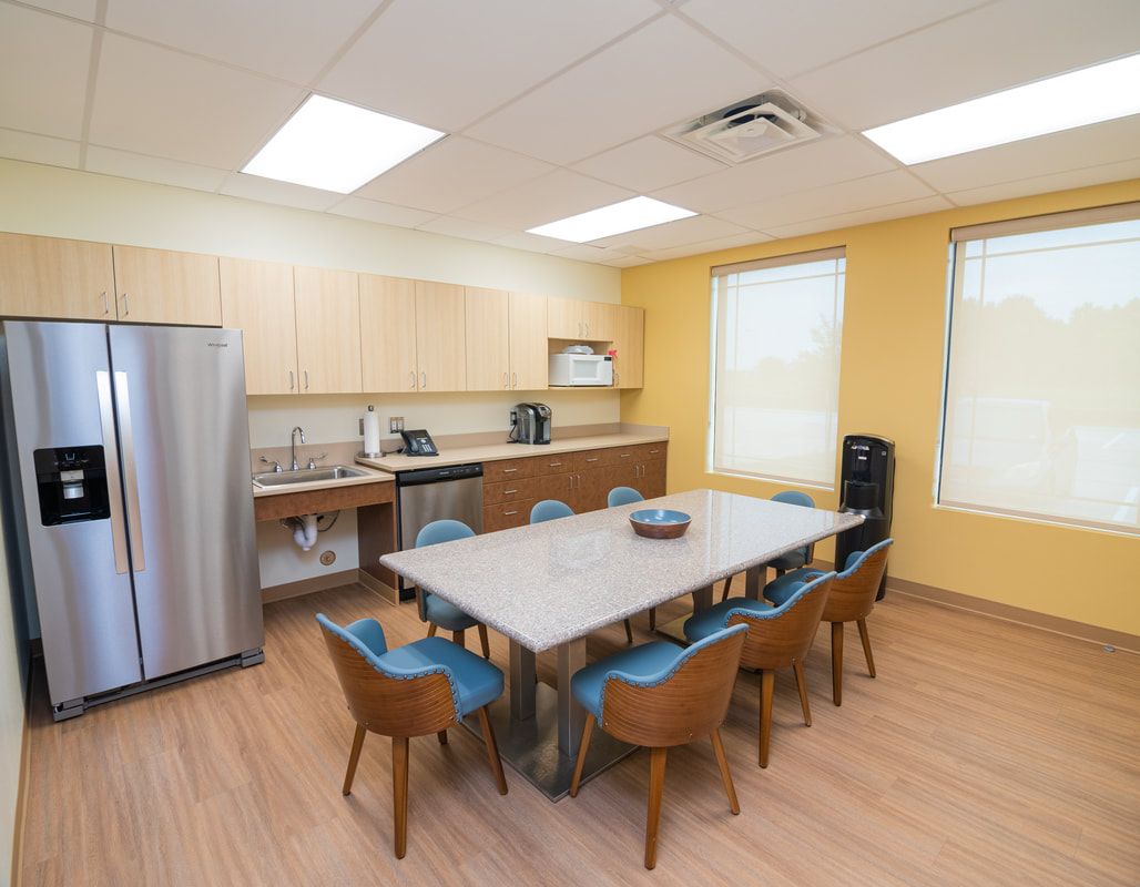 The employee lounge has 2 windows, a large conference table, refrigerator, dishwasher, microwave, and employee lockers—a big improvement over the lounge at the previous facility.
