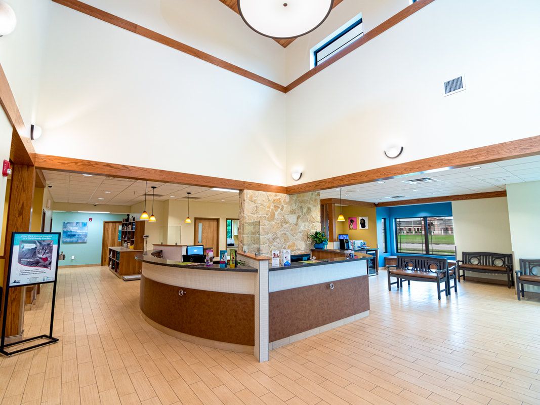 A circular reception desk greets clients upon entry to the hospital, encouraging a smooth traffic flow from intake to discharge. Four receptionists can sit at the counter at once to manage check-in, medication pickups, boarding admissions, and patient discharge. A lightly textured porcelain tile floor helps pets maintain their footing. The lobby is decorated in warm earth tones and features a children’s nook with seating, videos, and a craft area, as well as a refreshment counter with coffee, chilled bottled water, and packaged treats.