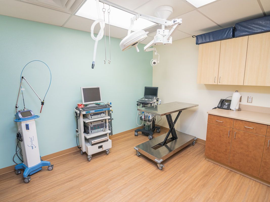 A special procedures room for performing endoscopy, ultrasound, and more. “Our biggest use of this space is for animals that are disagreeable, because we can take them into a…[quieter] room with subdued lighting,” says Dr. Lonsford. “Also, the female doctors wanted this space for nursing or pumping for their babies, because the room has no windows [but has] subdued lighting and locks for privacy.”